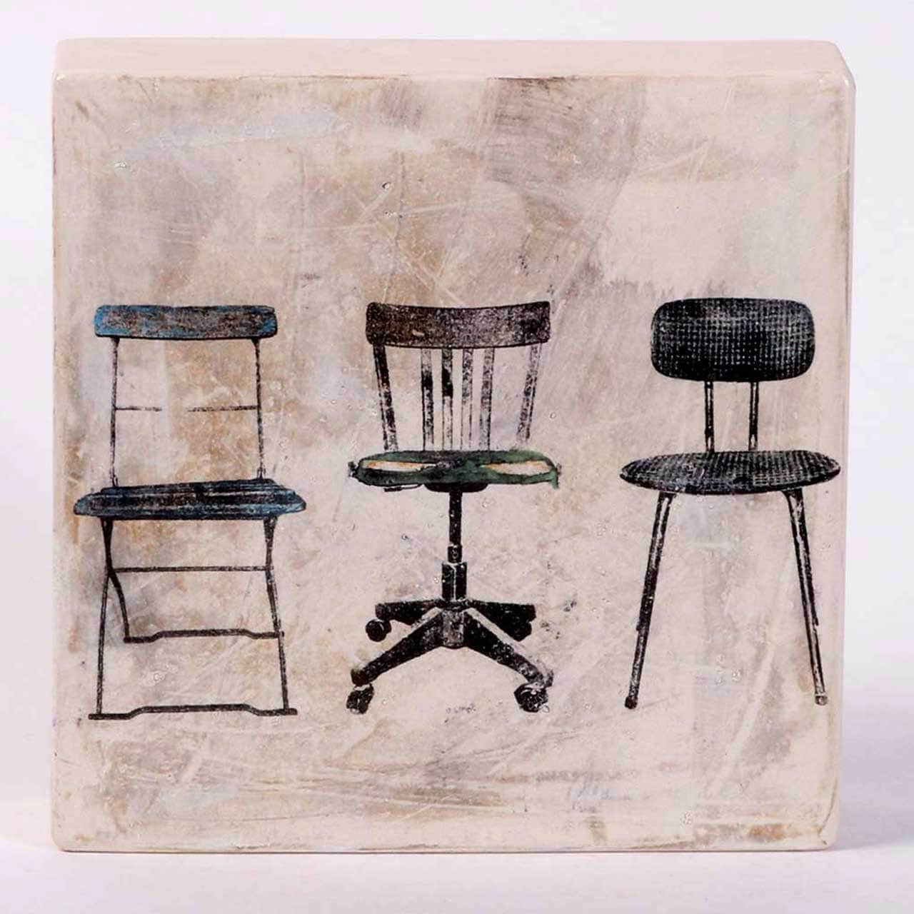 Bei diesem Konstobjekt aus Keramik handelt es sich um eine wünderschöne Handarbeit. Auf der quadratförmigen Kachel ist ein Nittrofrottage Print in bewußt verwischtem Schwarz mit einigen Transparenzen. Das Motiv zeigt Design Klassiker an Stühlen. Eine kostbare Aufwertung Ihres Schreibtischs oder Ihrer Anrichte.