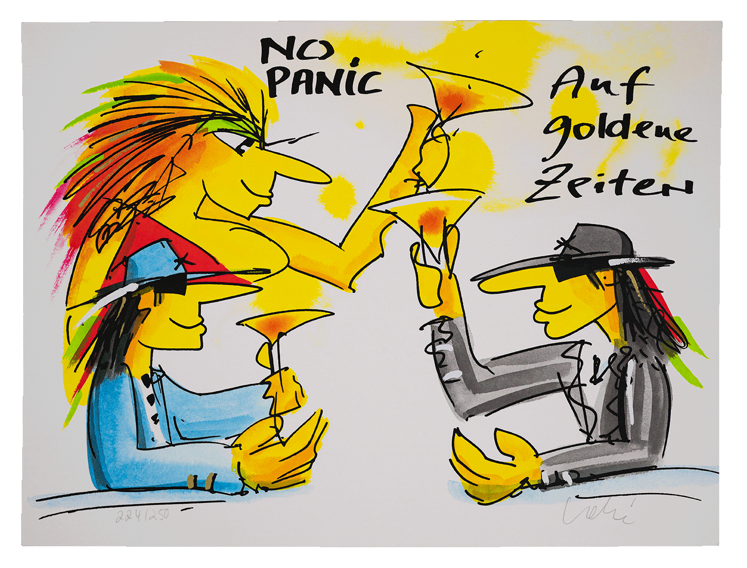 NO PANIC auf goldene Zeiten – dieser außergewöhnliche Siebdruck zeigt Udo Lindenberg in Bestform: Mit Hut, Sonnenbrille und einem Glas in der Hand prostet er einer stilvollen Lady voller Zuversicht zu. Ein charmanter Toast auf das Leben, die Freundschaft – und auf goldene Zeiten!